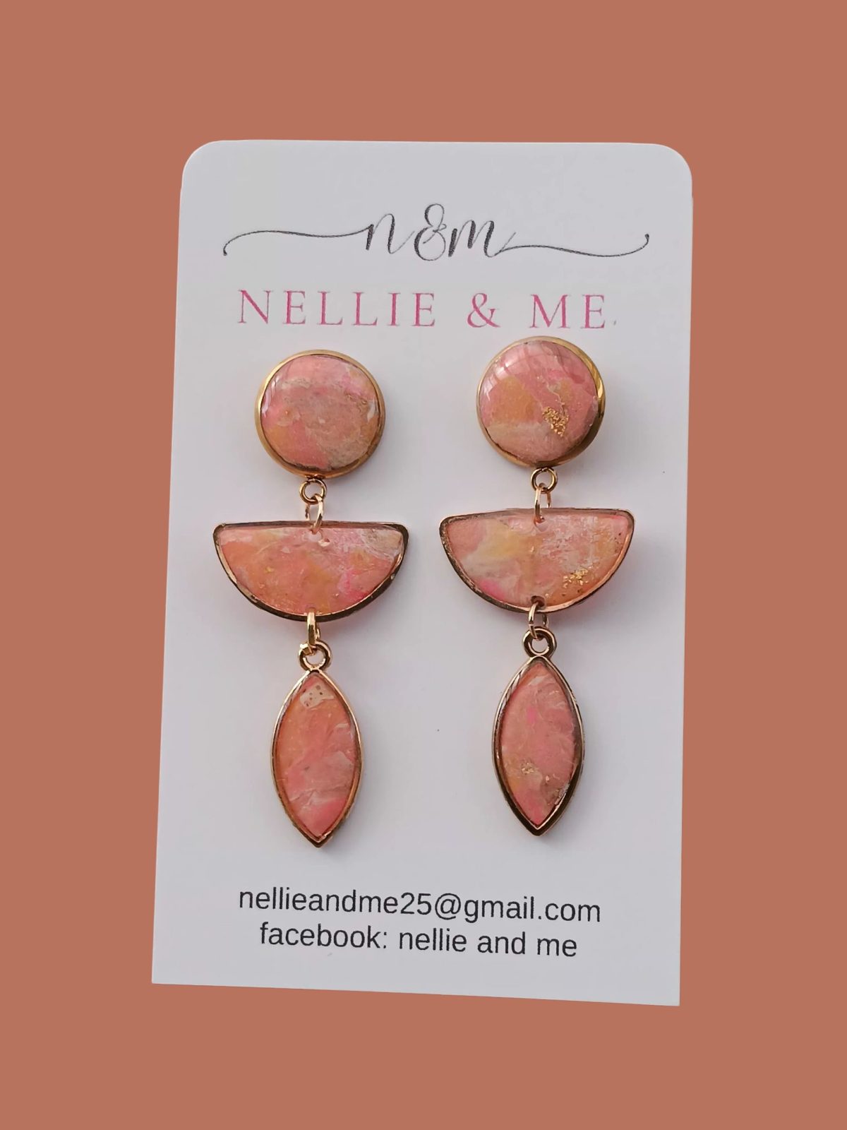 This unique design combines circular and half-moon shapes with a delicate teardrop accent. Each piece is framed in a gold-tone setting, enhancing the natural beauty of the stone-like material. Lightweight and comfortable, these earrings are perfect for both casual outings and special occasions.