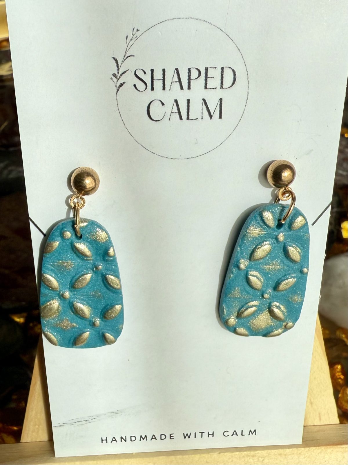 Teal aqua green with gold detailing dangle earrings measure approximately 3.5cm long by 1.5cm wide