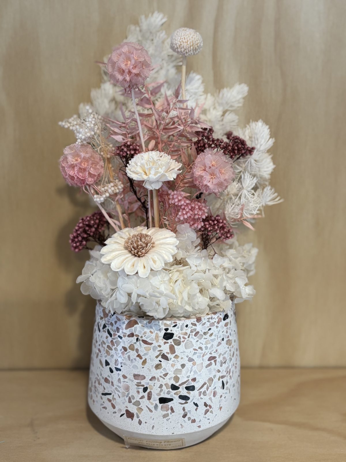 Medium arrangement in terrazzo pot with pink and white flowers and daisies