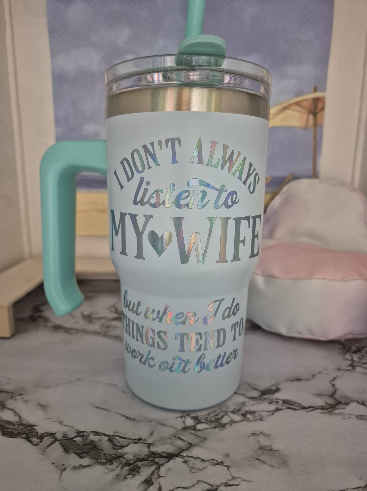 Tumbler that holds up to 600ml or hot or cold liquids. Ladies this is one to give your husband. Featuring the saying, “I Don’t Always Listen to My Wife, But When I do Things Tend to Work Out Better”.