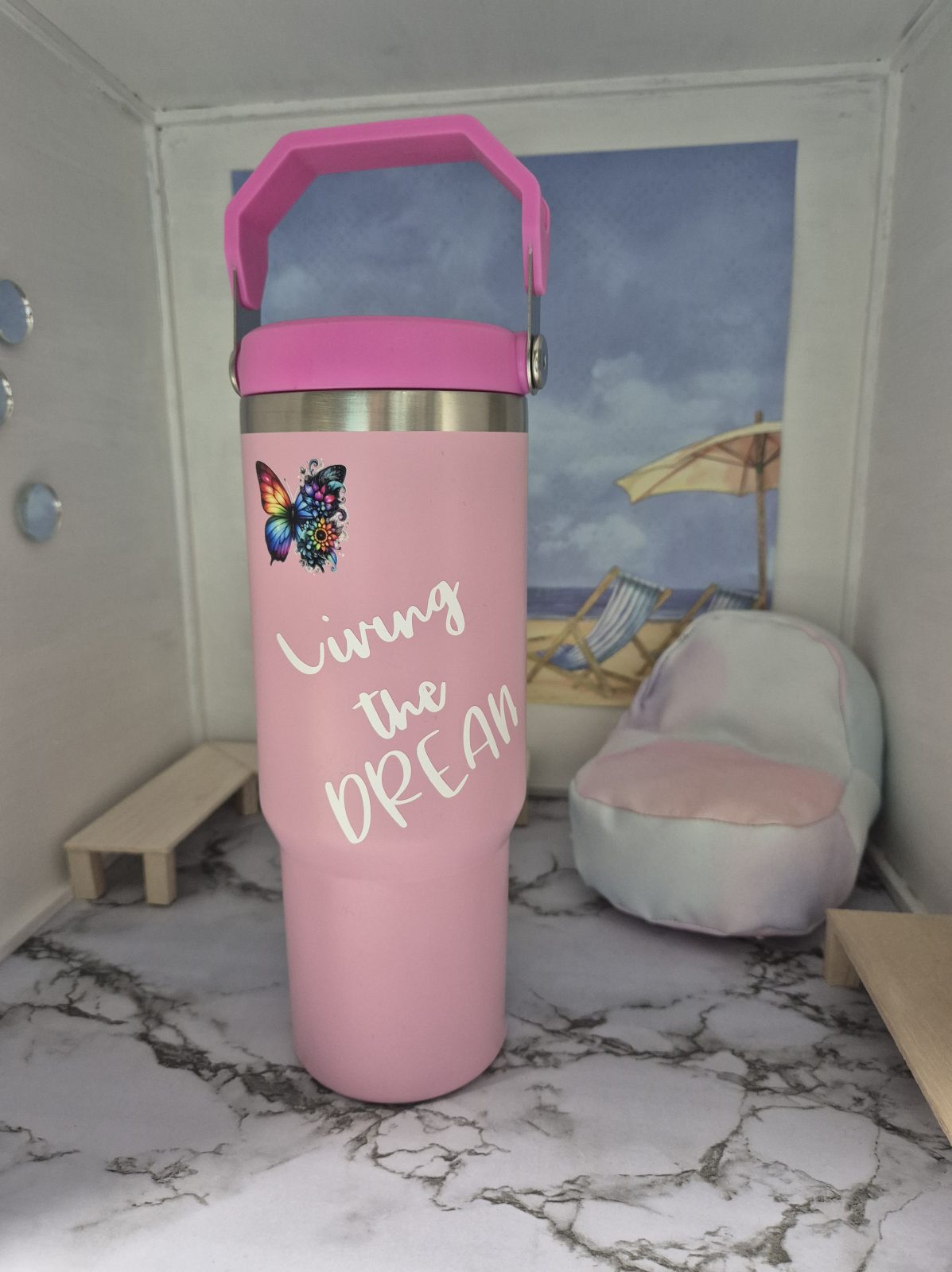 Tumbler holds 840ml for hot or cold liquids. Featuring at cute little Butterfly and the works “Living The Dream”.