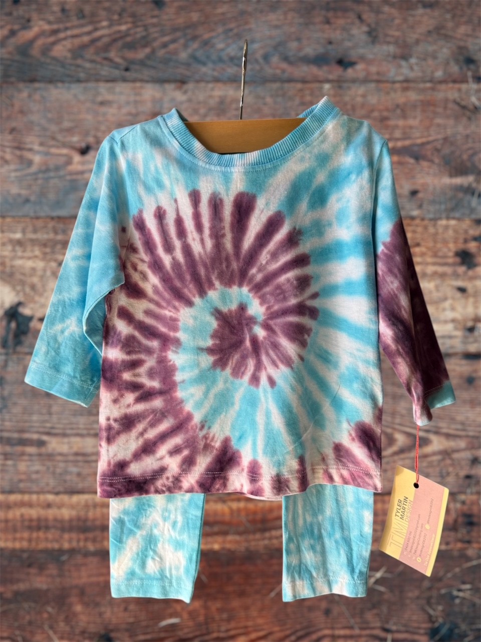 Handmade turquoise and purple set with a long sleeved top and leggings.