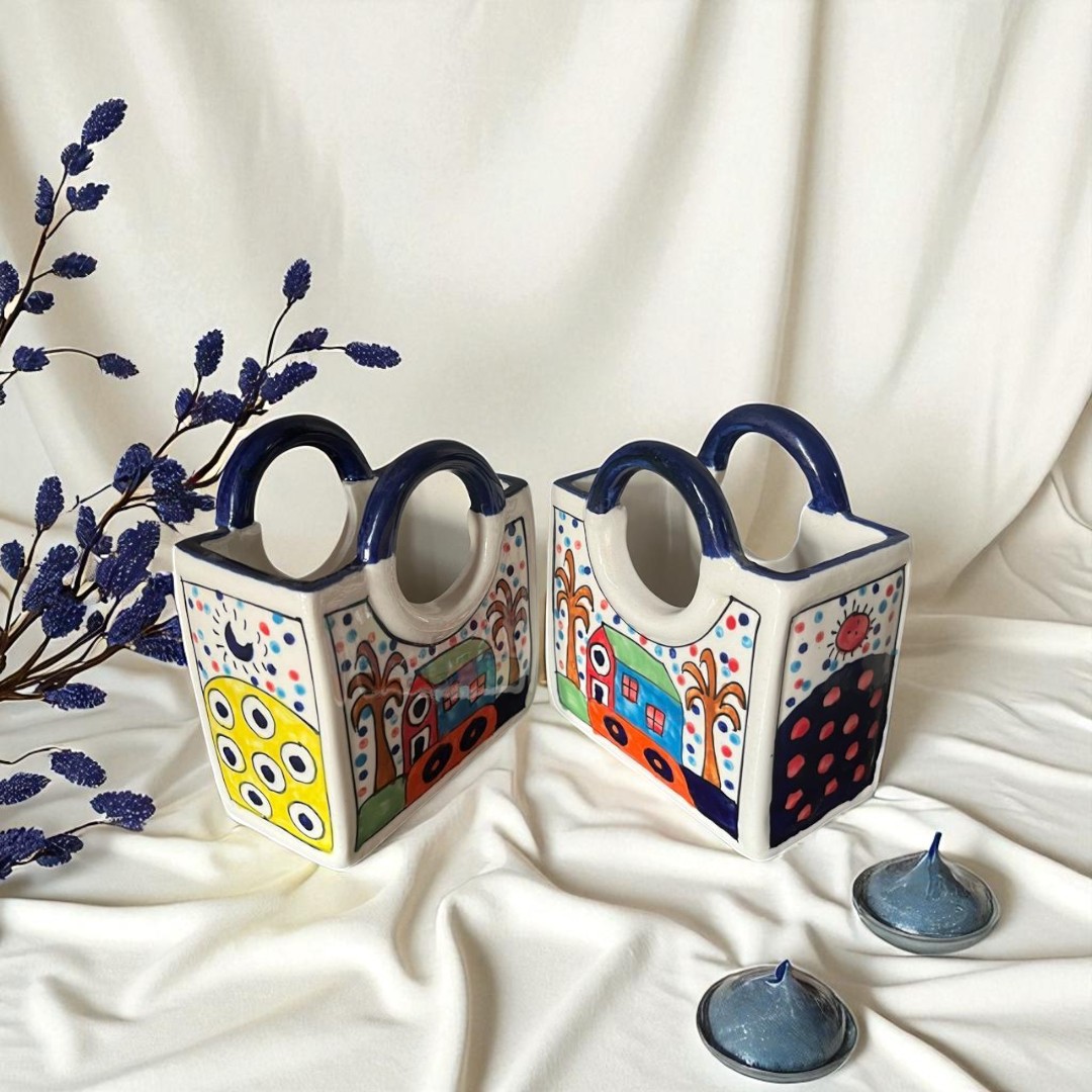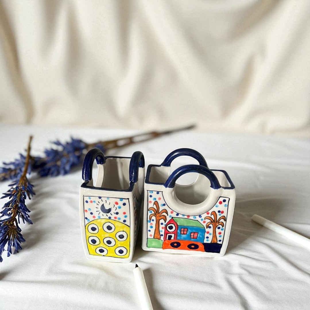 Art meets function in this enchanting basket-shaped handmade container. With a soft white base brought to life by bold, hand-painted abstract art of whimsical houses, trees, and landscapes, it feels like carrying a miniature storybook village in your hands. The sturdy blue handle adds both contrast and charm, making it as striking as it is practical.