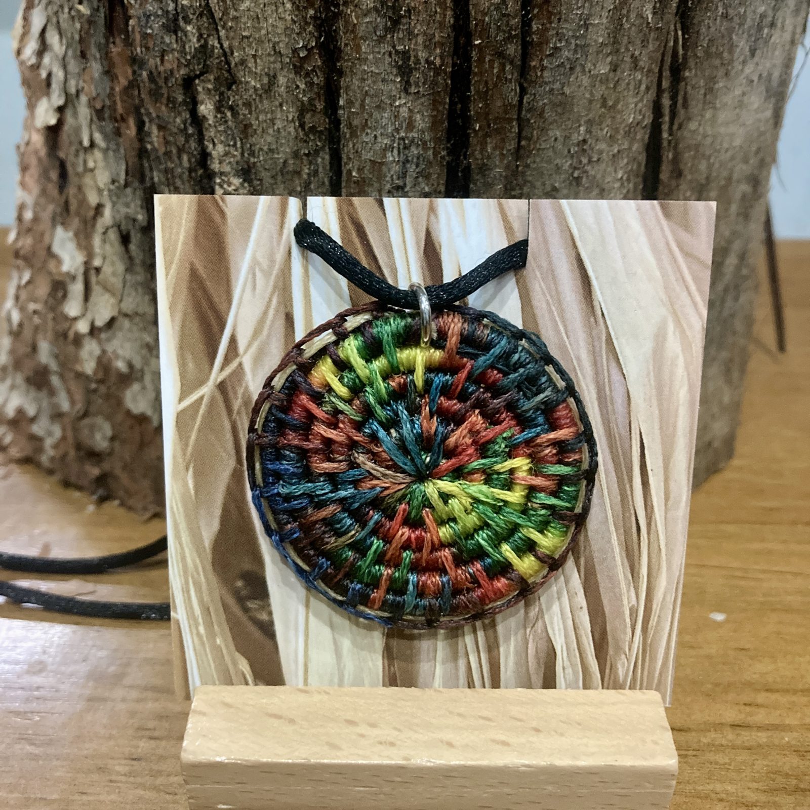 This raffia and multi-coloured wax thread coil is a statement-wear piece.