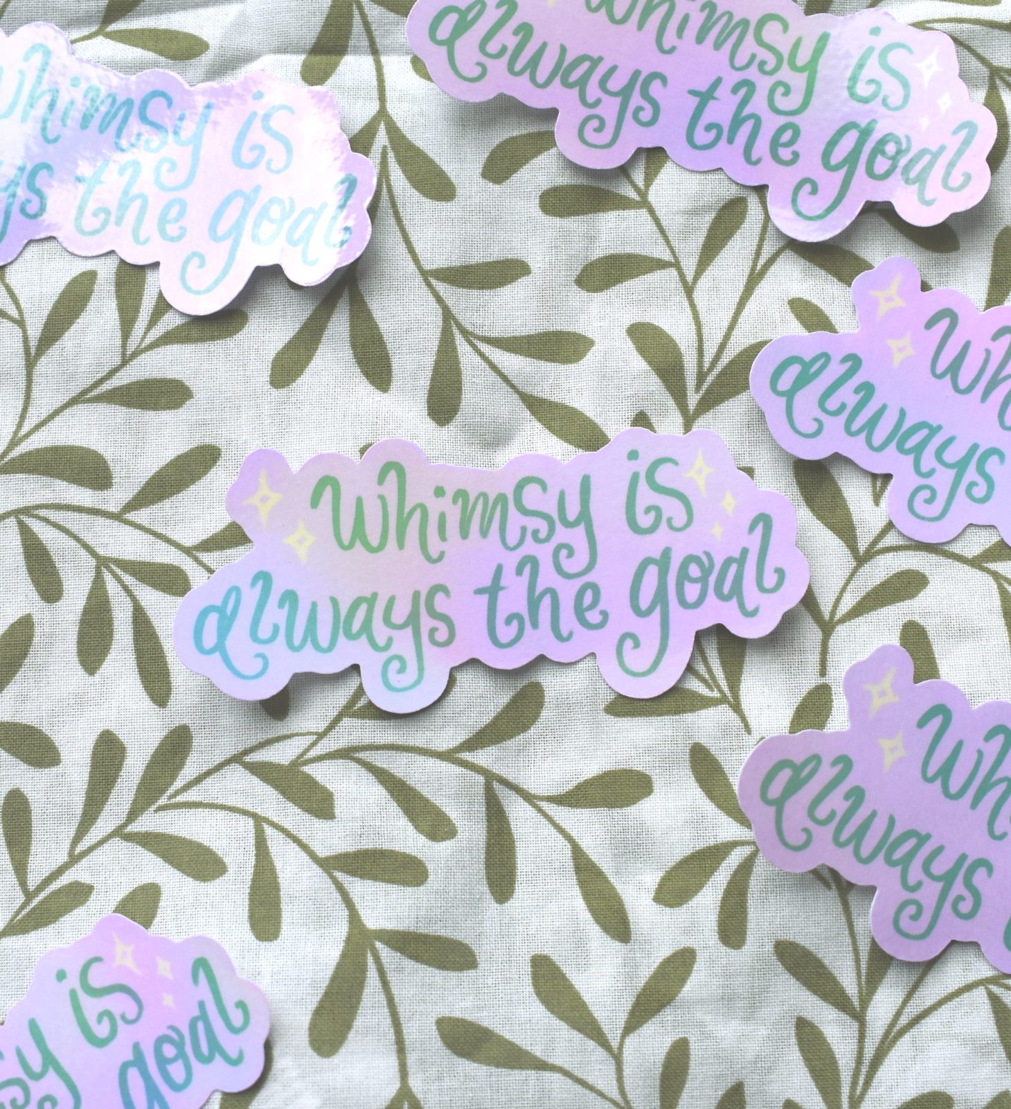 Shimmering holographic vinyl sticker with a whimsical hand-lettered design. Durable, waterproof & perfect for laptops, water bottles, and journaling.