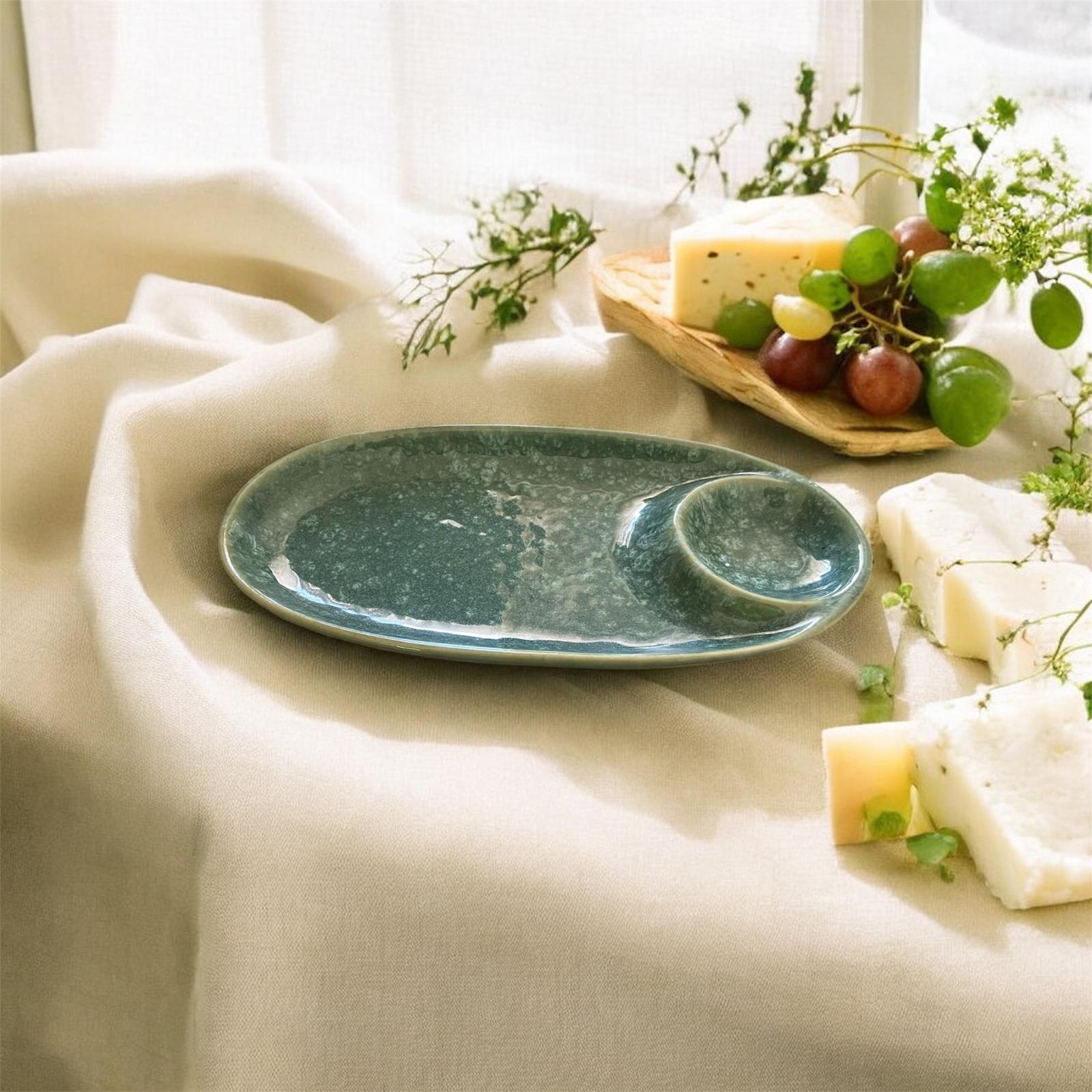 A handcrafted ceramic platter glazed in layered shades of green, echoing the textures of forest leaves and mossy earth. Designed with a thoughtful dipping space, it’s perfect for serving snacks, fruits, or shared meals. Both functional and artful, this piece brings a touch of nature’s calm to your table.